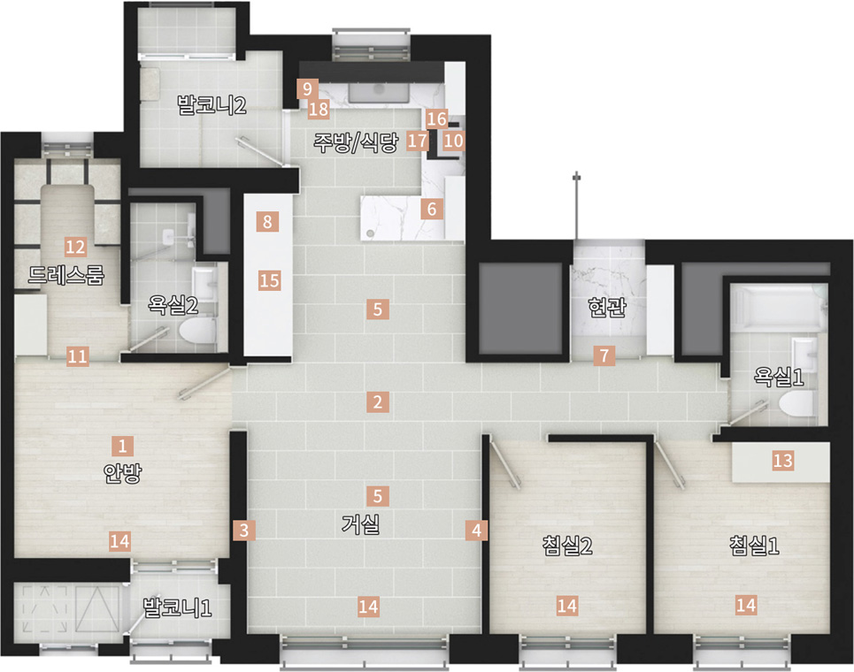 7 현관중문 8 냉장고장 특화 9 주방액정 TV
